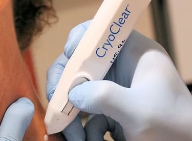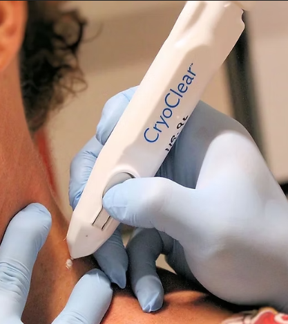 CryoClear is a non-invasive skin treatment that uses cold temperatures to safely and effectively remove superficial skin imperfections. This treatment involves the application of carbon dioxide (CO₂) at extremely low temperatures to targeted areas of the skin, such as age spots, sun spots, skin tags, and other benign lesions. During the procedure, the CO₂ freezes the cells within the unwanted spot, causing them to crystallize and die.